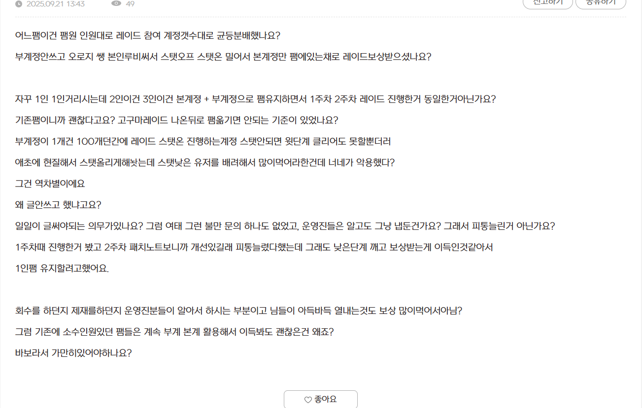 그리고 기존 소수 팸들 말하셨는데 그게 이제 영자들이 미흡했던 부분인거죠 ㅋㅋㅋ 재화 한도를 정하든 뭘 걸어야 하는데 그게 안되니 소수 팸들은 이득을 봤죠? 그건 그쪽이 말했던 시스템 문제가 맞고 근데 본인은 그냥 독식을 위해 떠나서 부캐 다 박아서 그걸로 이득을 보신 분이구요 ㅋㅋㅋㅋ 왜 핀트를 집어주면 자꾸 그게 다른데로 새지 팩트 꽂혀서 반박을 못하니까 억지 부리시네 ㅋㅋ 땡깡 잘봤습니다