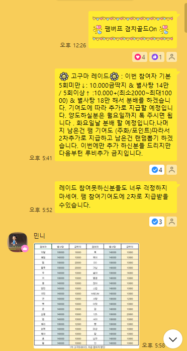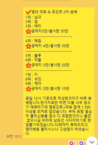 저희는 2차로 팸포인트 & 주화 순위로 지급한다해서 팸원들이 더 열심히 했죠? 팸활동을