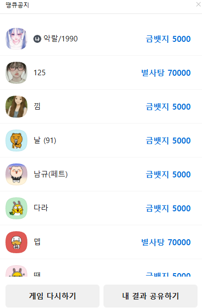 그리구 독점하신분들  그렇게 혼자  꿀걱과 여기 저희팸사람들은 1/2만 ~ 많아야 5만 금뱃지받고 / 별사탕도 10/20만씩 많아야 50만 받구있는데