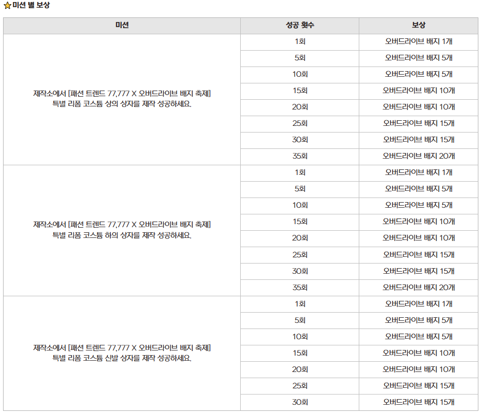 이번 리폼 코스튬 제작소 & 미션 이벤트 수행하는데 들어가는 필요 재화량 조사 결과 입니다.
