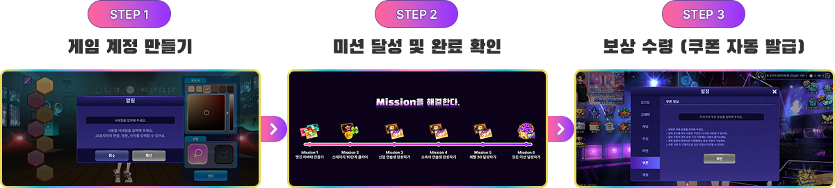 · 각 미션 클리어와 보상 수령은 신규 계정 당 1회 씩만 가능합니다.