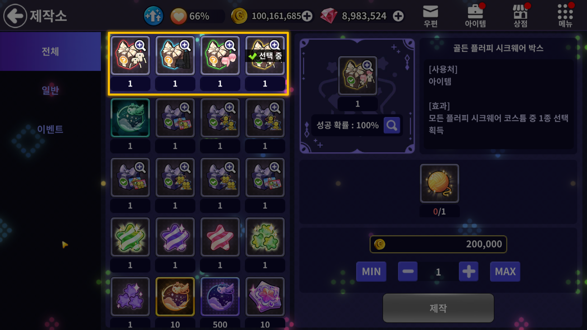 골든 플러피 시크웨어 박스 1개 | 100% | 황금 실타래 1개 200,000 골드 |