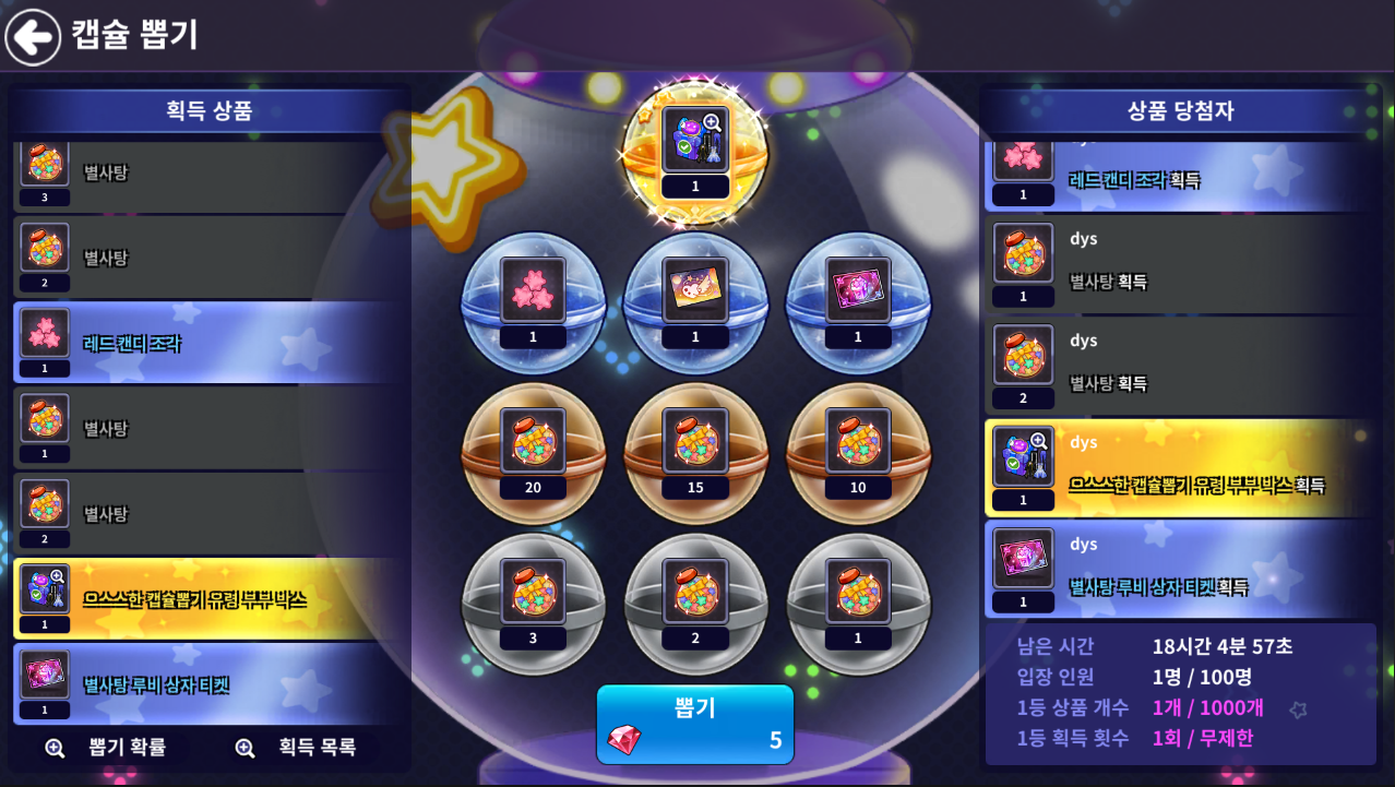 - 캡슐 뽑기 입장 후 5 루비를 지불하여 캡슐을 뽑을 수 있습니다.