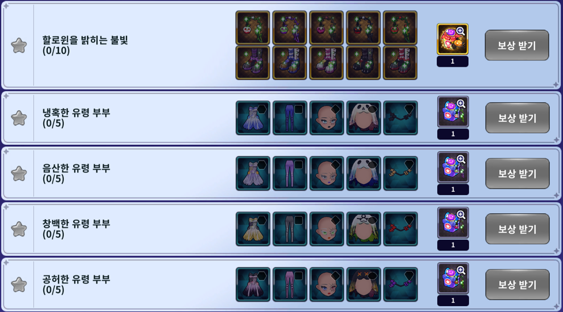 | 음산한 유령 부부 | 으스스한 꿈 속 유령 신랑 코트 퍼플 으스스한 꿈 속 유령 신랑 본 팬츠 퍼플 으스스한 꿈 속 유령 신랑 페이스 스크림 으스스한 꿈 속 유령 부부의 베일 블루 으스스한 꿈 속 유령 부부 목걸이 펌킨 | 으스스한 꿈 속 유령 신랑 코트 퍼플 으스스한 꿈 속 유령 신랑 본 팬츠 퍼플 으스스한 꿈 속 유령 신랑 페이스 스크림 으스스한 꿈 속 유령 부부의 베일 블루 으스스한 꿈 속 유령 부부 목걸이 펌킨 | 음산한 유령 부부 (보상 : 스켈리 초코 애플 랜턴 퍼플) |