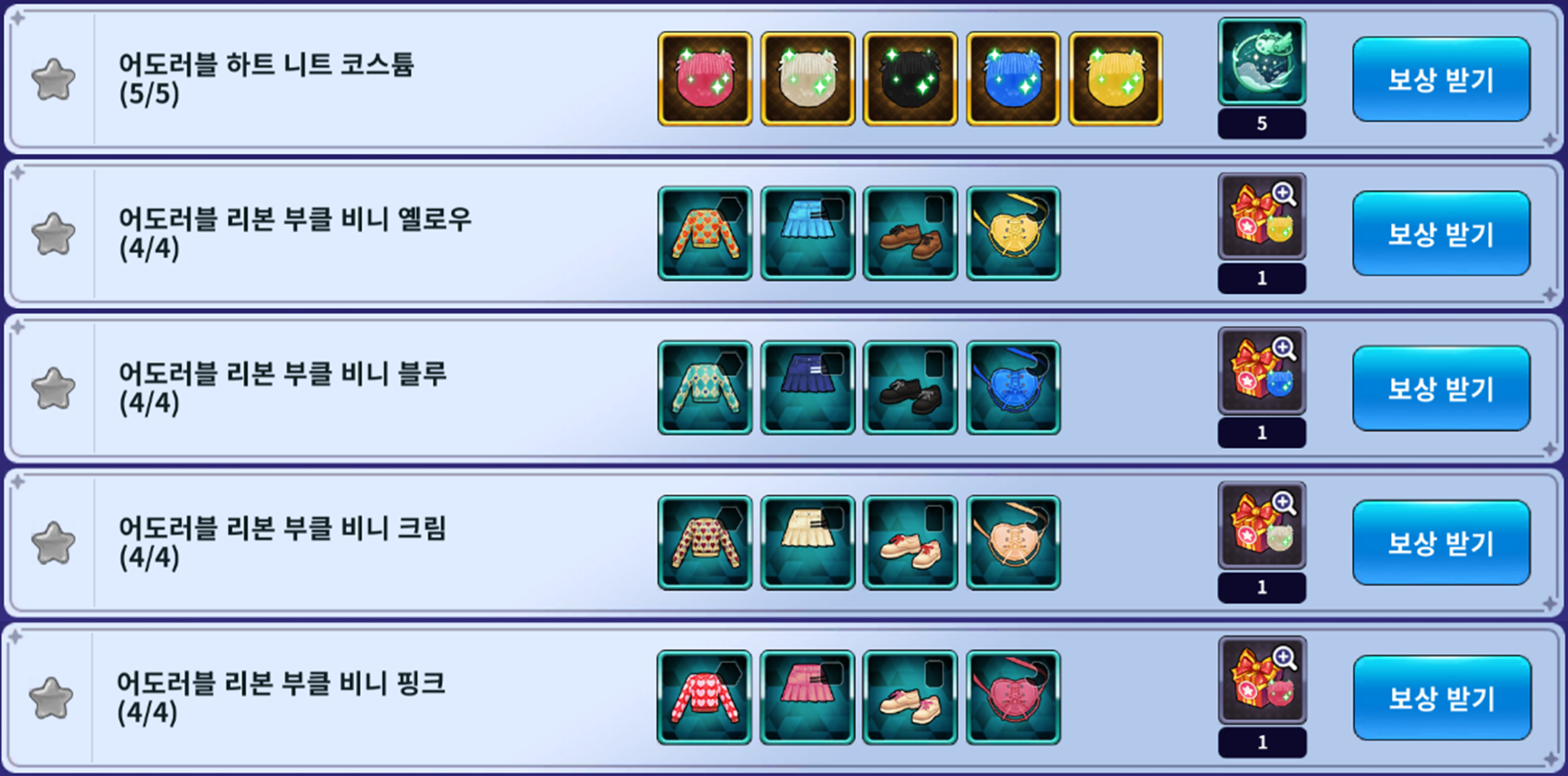 | 어도러블 하트 니트 코스튬 | 어도러블 리본 부클 비니 핑크 어도러블 리본 부클 비니 크림 어도러블 리본 부클 비니 블랙 어도러블 리본 부클 비니 블루 어도러블 리본 부클 비니 옐로우 | 어도러블 리본 부클 비니 핑크 어도러블 리본 부클 비니 크림 어도러블 리본 부클 비니 블랙 어도러블 리본 부클 비니 블루 어도러블 리본 부클 비니 옐로우 | 오버드라이브 배지 5개 |