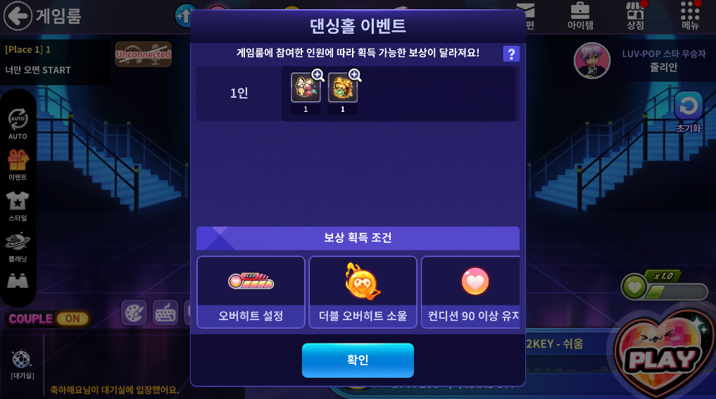 - 각 모드에서 댄싱홀 이벤트 보상 획득 조건을 맞추어 게임 클리어 시,