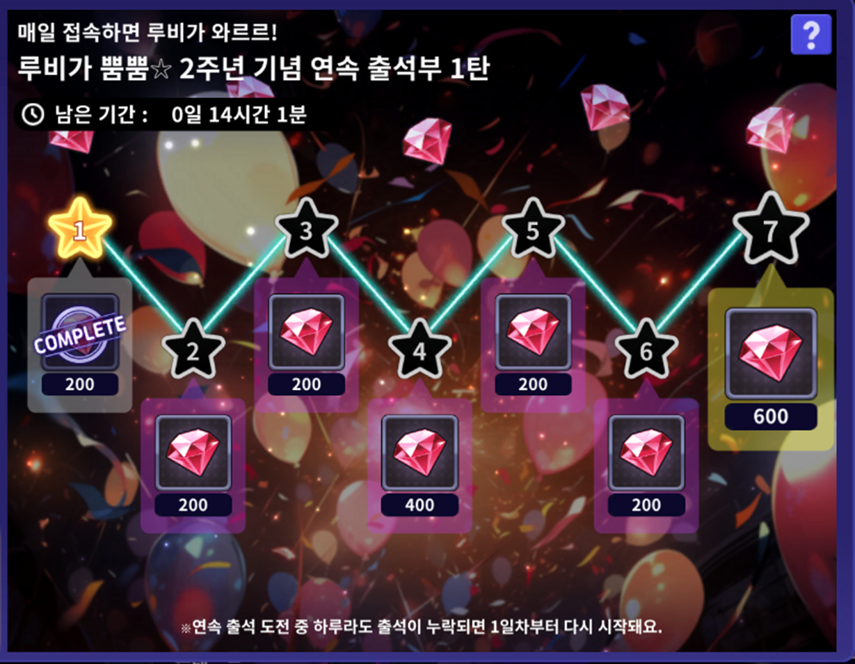- [메인화면] - [메뉴] - [출석부] - [루비가 뿜뿜☆ 2주년 기념 연속 출석부 1탄]을 통해 확인할 수 있습니다.