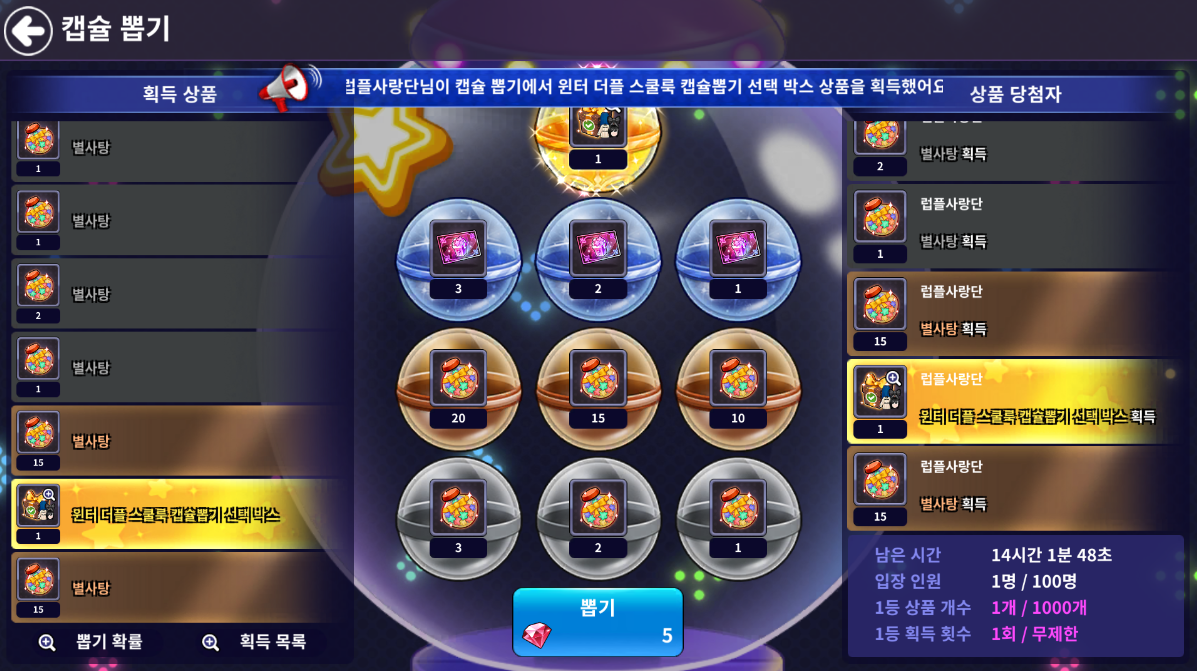 - 1등 상품에 한정된 개수가 모두 소진되거나, 진행 시간이 마감될 경우 해당 캡슐 뽑기가 종료됩니다.