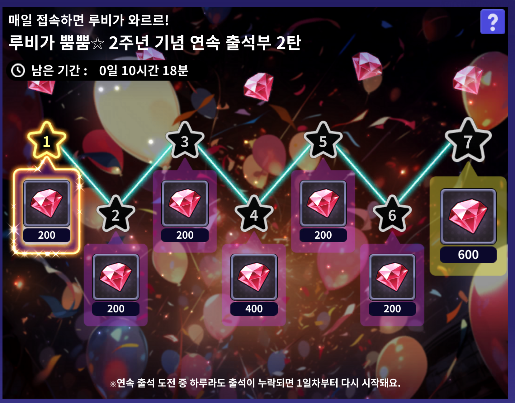 - [메인화면] - [메뉴] - [출석부] - [루비가 뿜뿜☆ 2주년 기념 연속 출석부 2탄]을 통해 확인할 수 있습니다.