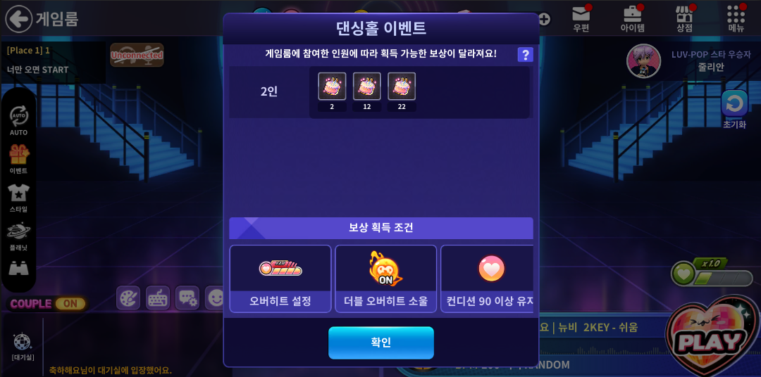 - 각 모드에서 댄싱홀 이벤트 보상 획득 조건을 맞추어 게임 클리어 시, 럽플레이스 두 살 축하해! 코인을 획득할 수 있습니다.