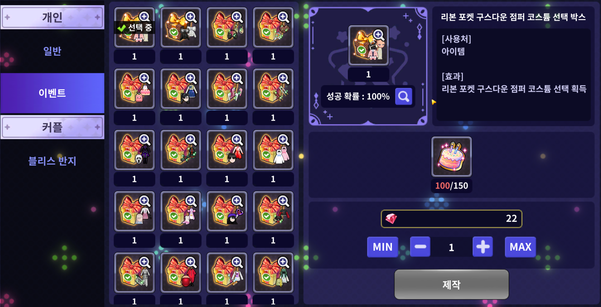 | 사랑스러운 숏패딩 코스튬 선택 박스 | 럽플레이스 두 살 축하해! 코인 150개 22 루비 | 100% |