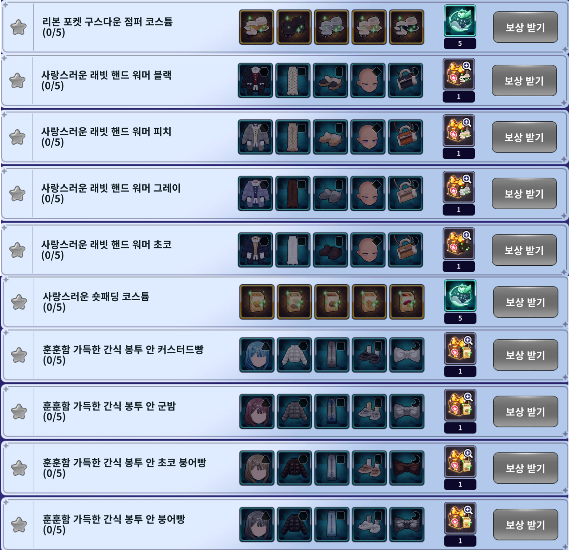 | 훈훈함 가득한 간식 봉투 안 군밤 | 큐티 X핀 포인트 벼머리 헤어 큐티 숏패딩 그레이 큐티 패턴 와이드 진 큐티 복슬 블로퍼 큐티 아이코닉 빅 리본 | 사랑스러운 큐티 숏패딩 수집 보상 박스 (보상 : 훈훈함 가득한 간식 봉투 안 군밤) |