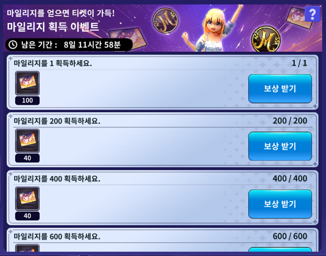 | 마일리지를 600 획득하세요. | 럽스페이스 뉴픽업 소환 티켓 40개 |