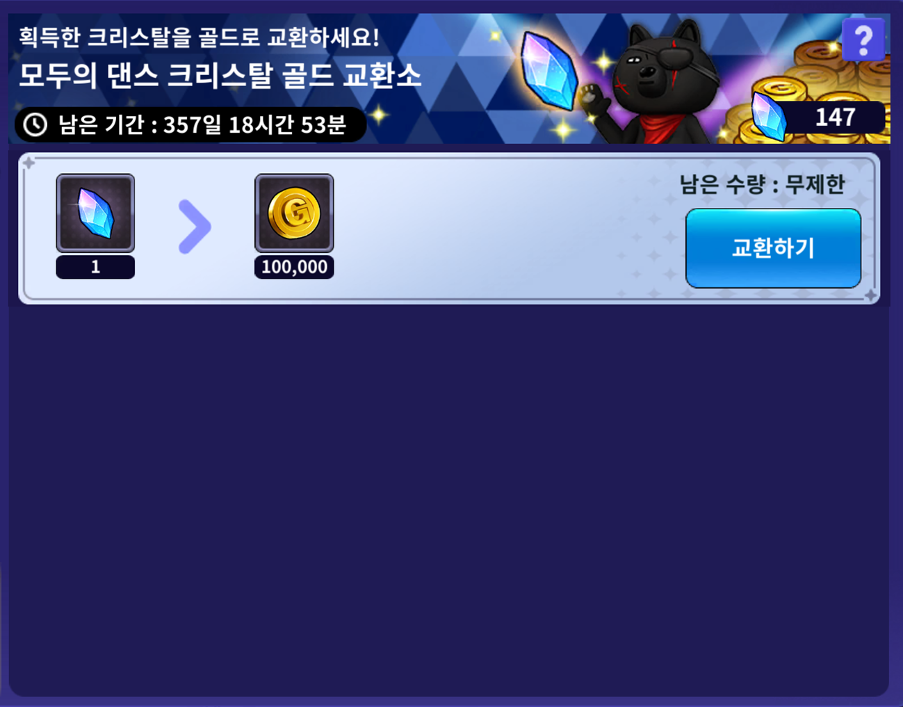 - 모두의 댄스 모드에서 클리어 보상으로 획득한 크리스탈 아이템을 골드로 교환할 수 있습니다.