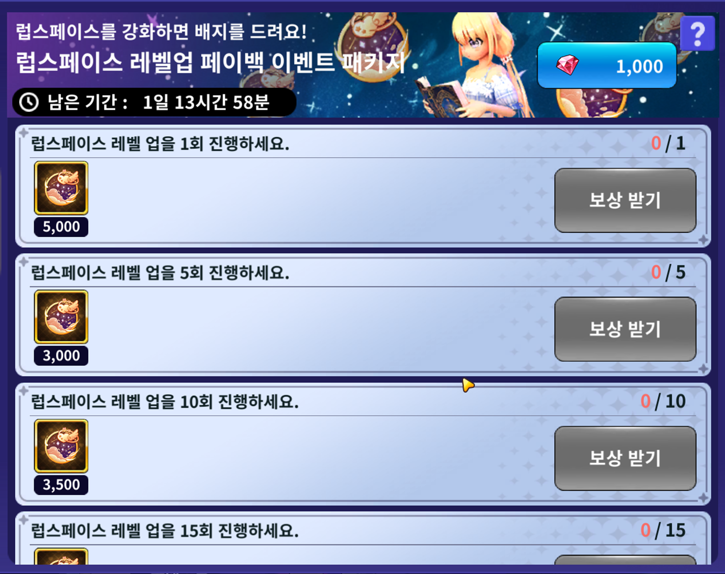 | 별자리 강화를 시도 15회 시도하세요. | 별사탕 14,000개 | 럽스페이스 레벨 업을 20회 진행하세요. | 럭셔리 럽스페이스 배지 2,000개 |