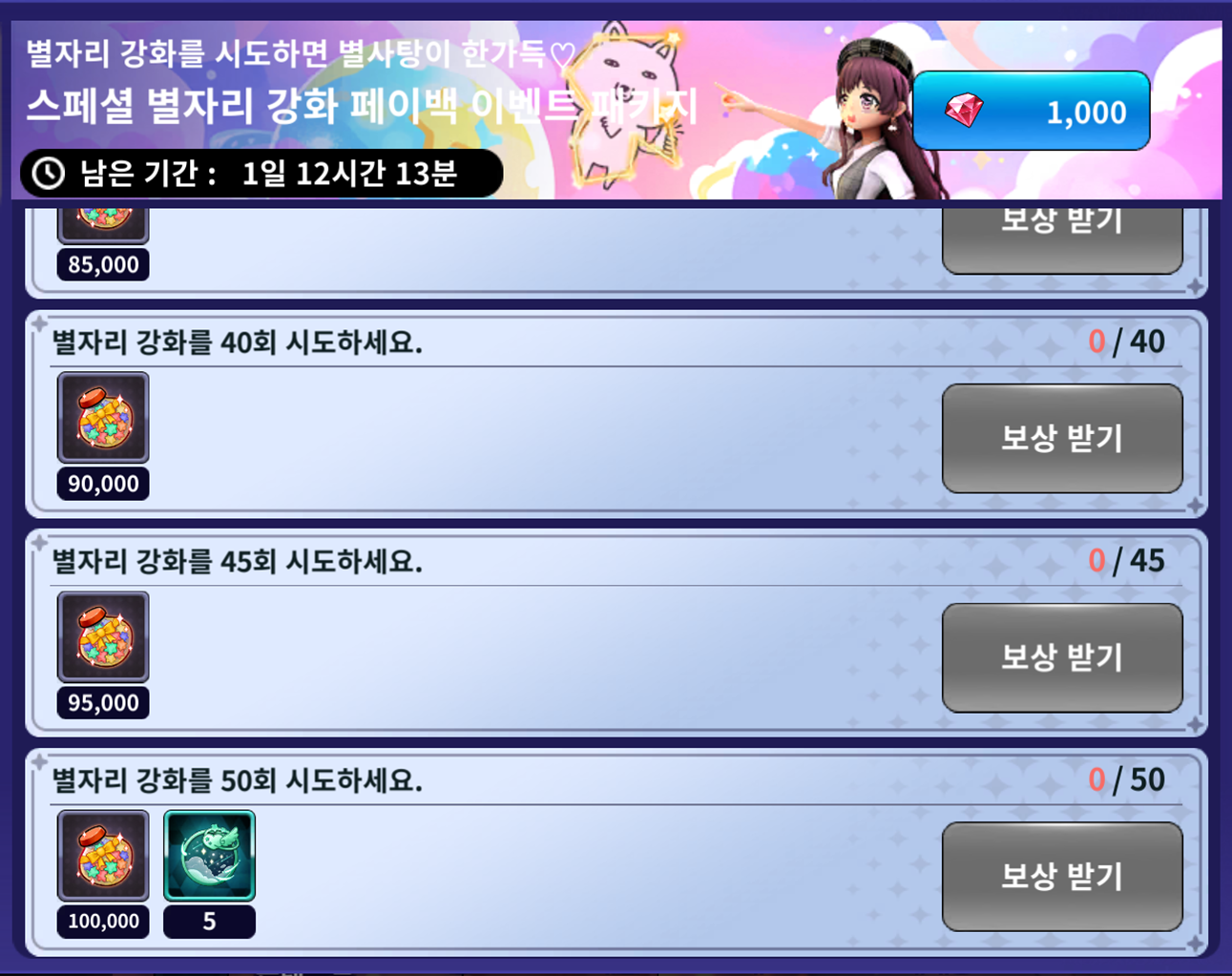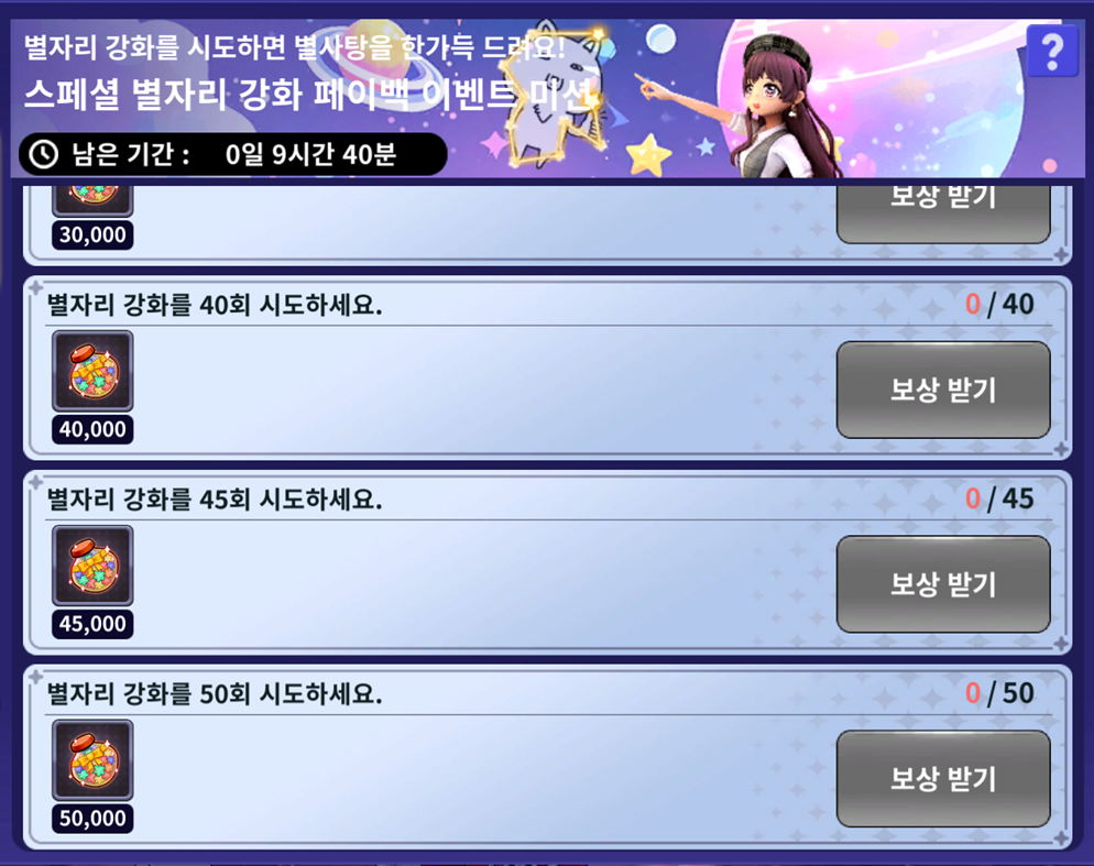 | 별자리 강화를 시도 50회 시도하세요. | 별사탕 50,000개 | ||