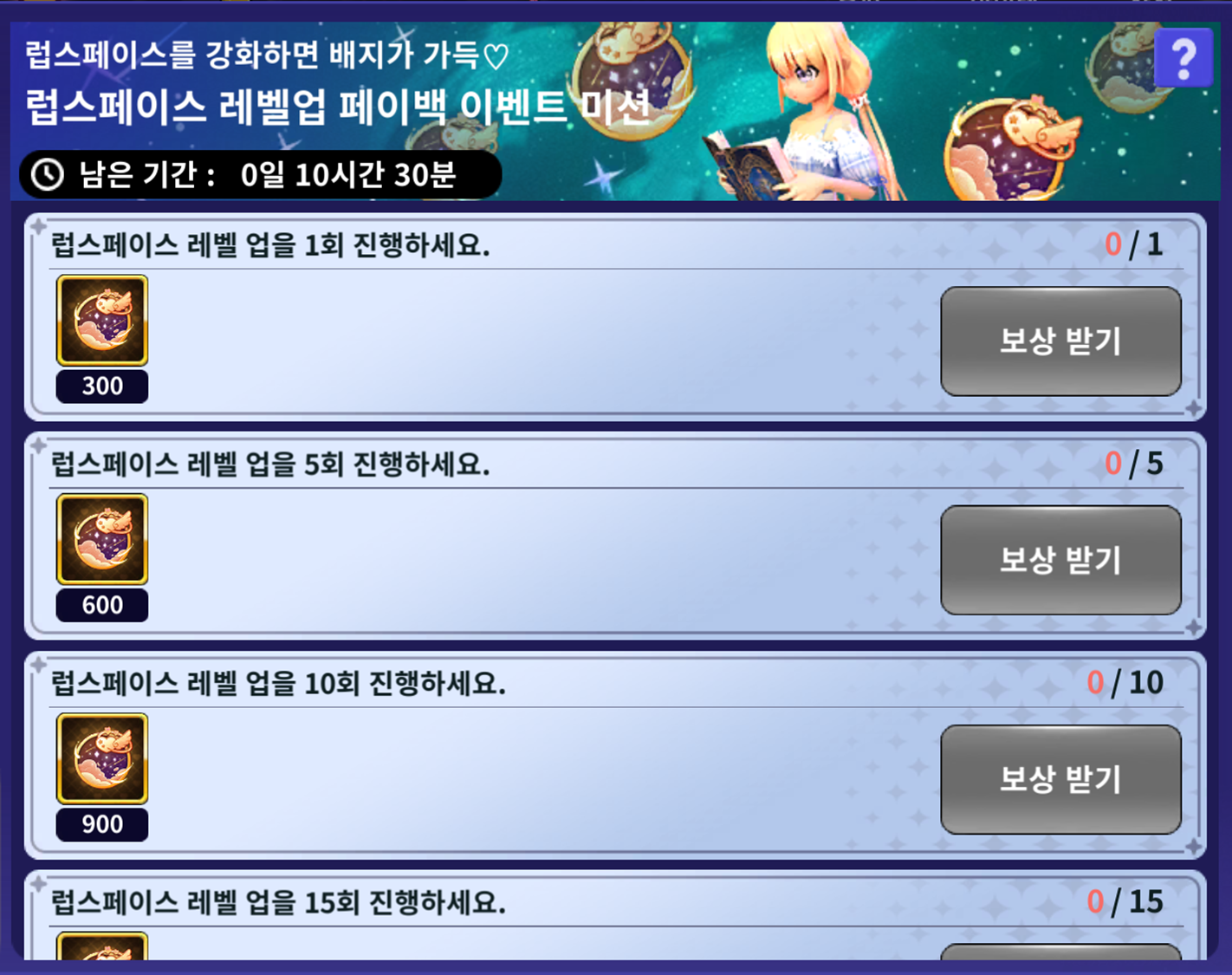 | 별자리 강화를 시도 5회 시도하세요. | 별사탕 10,000개 | 럽스페이스 레벨 업을 10회 진행하세요. | 럭셔리 럽스페이스 배지 900개 |