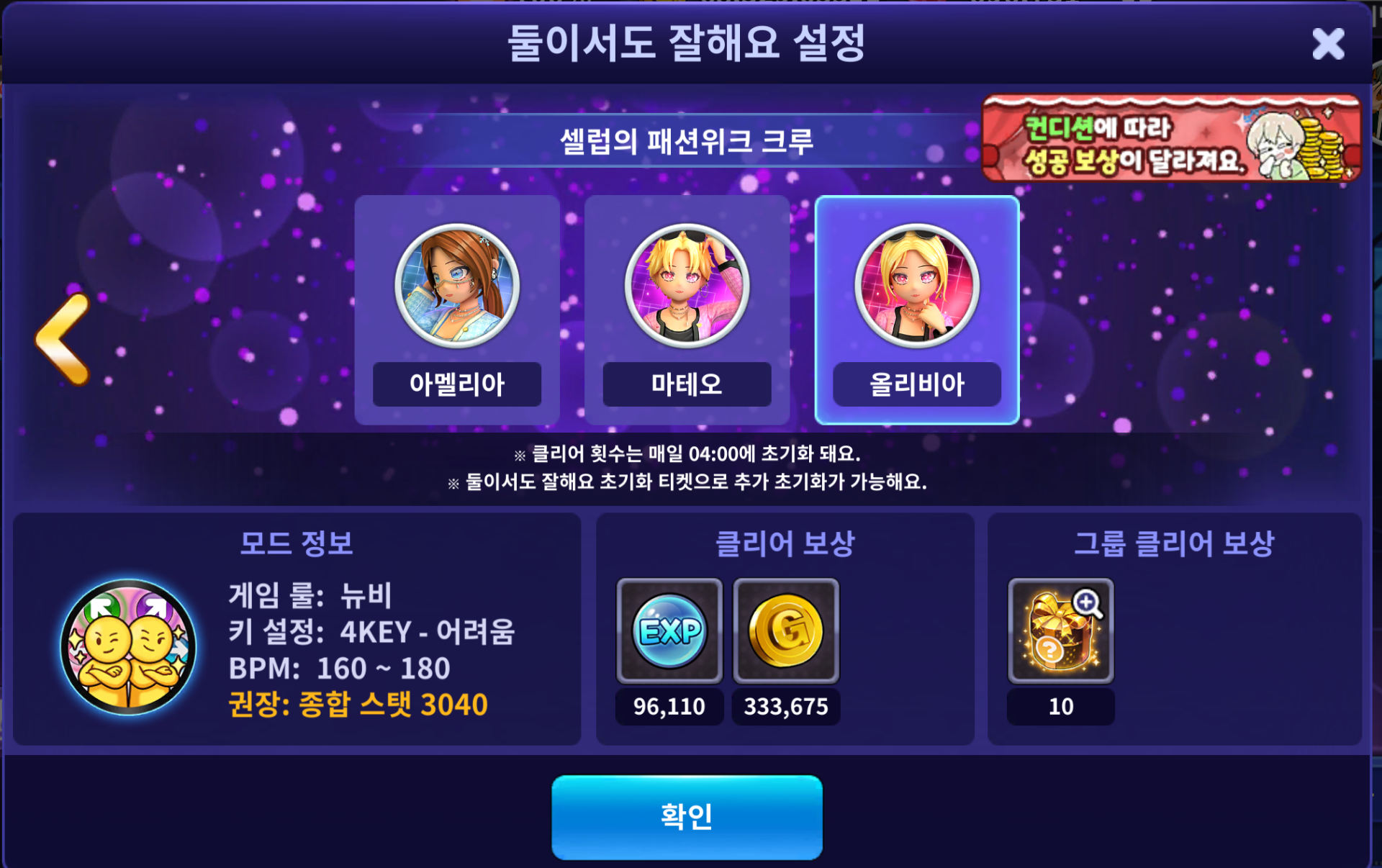- 이벤트 기간 동안, 댄싱홀에서 혼자서도 잘해요 / 둘이서도 잘해요 모드 클리어 시 골드 획득량이 기존 대비 1.5배로 증가됩니다.