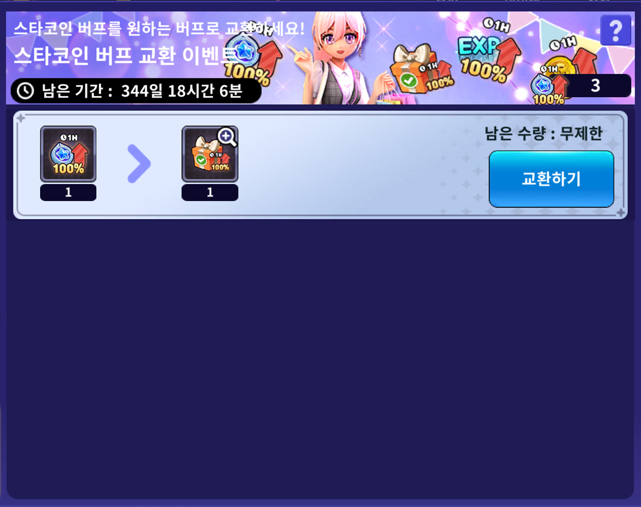 - [스타코인 100% 버프(1시간)] 아이템을 [올인원 버프 100%(1시간) 선택 박스] 아이템으로 교환할 수 있습니다.