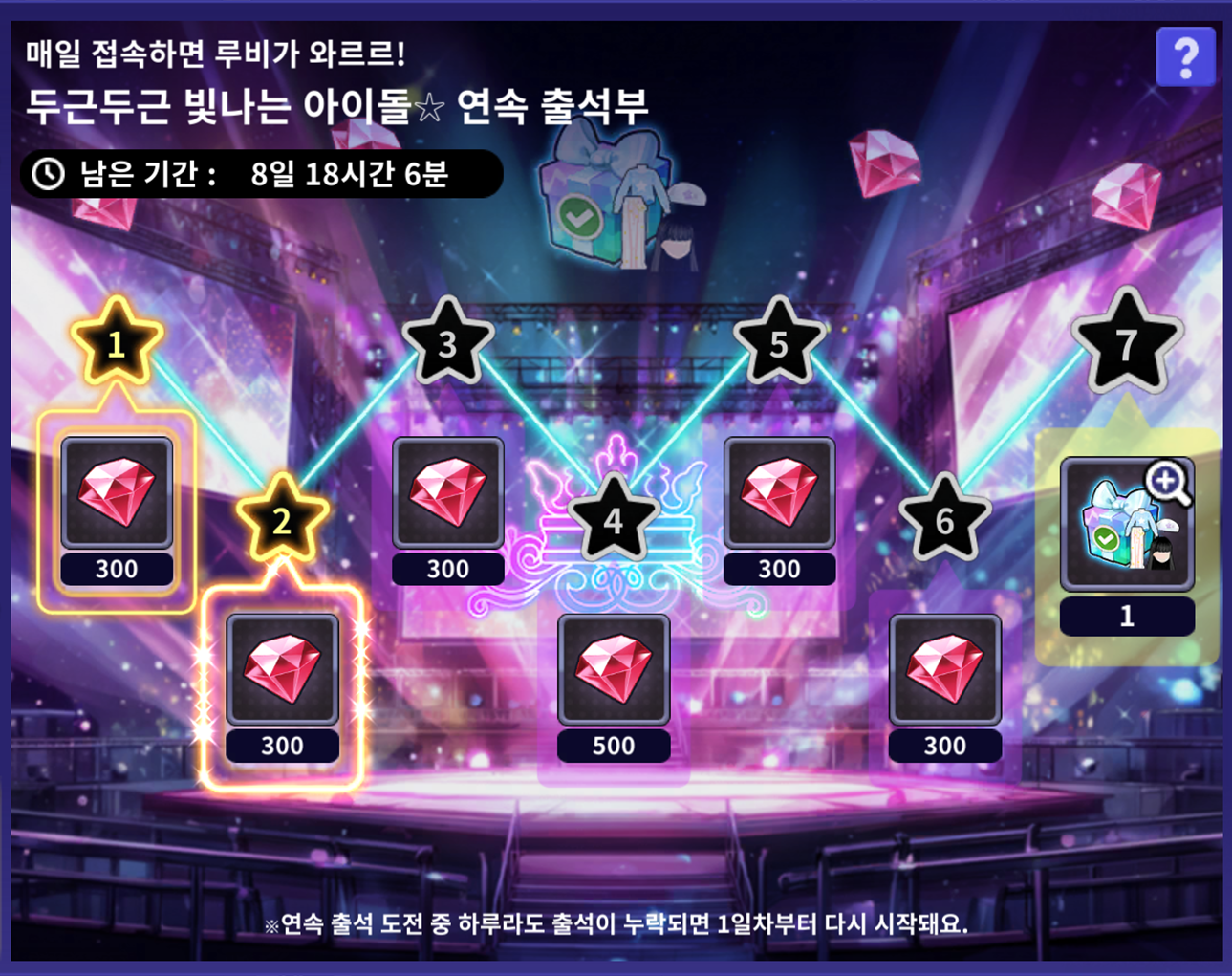 연속 7일 출석을 달성하고 최대 2,000 루비💎와 두근두근 빛나는 아이돌 코스튬 연속 출석 보상 선택 박스🎁를 받아가세요!