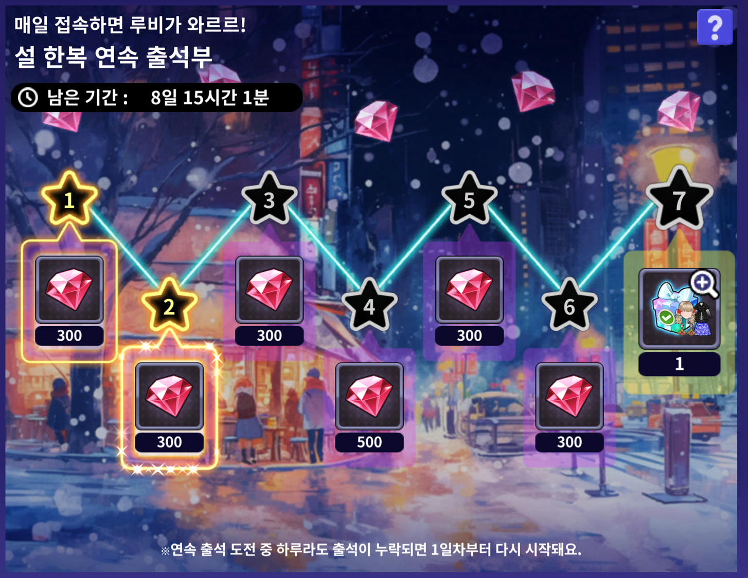 - 연속 출석에 실패할 경우 1일차부터 다시 출석이 진행됩니다.