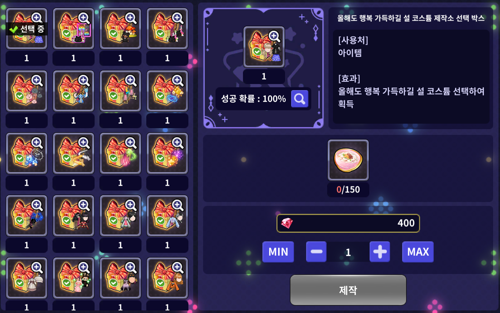 | 올해도 행복 가득하길 설 코스튬 제작소 선택 박스 | 선배 마음에 떡떡 꾸룩꾸룩 150개 400 루비 |