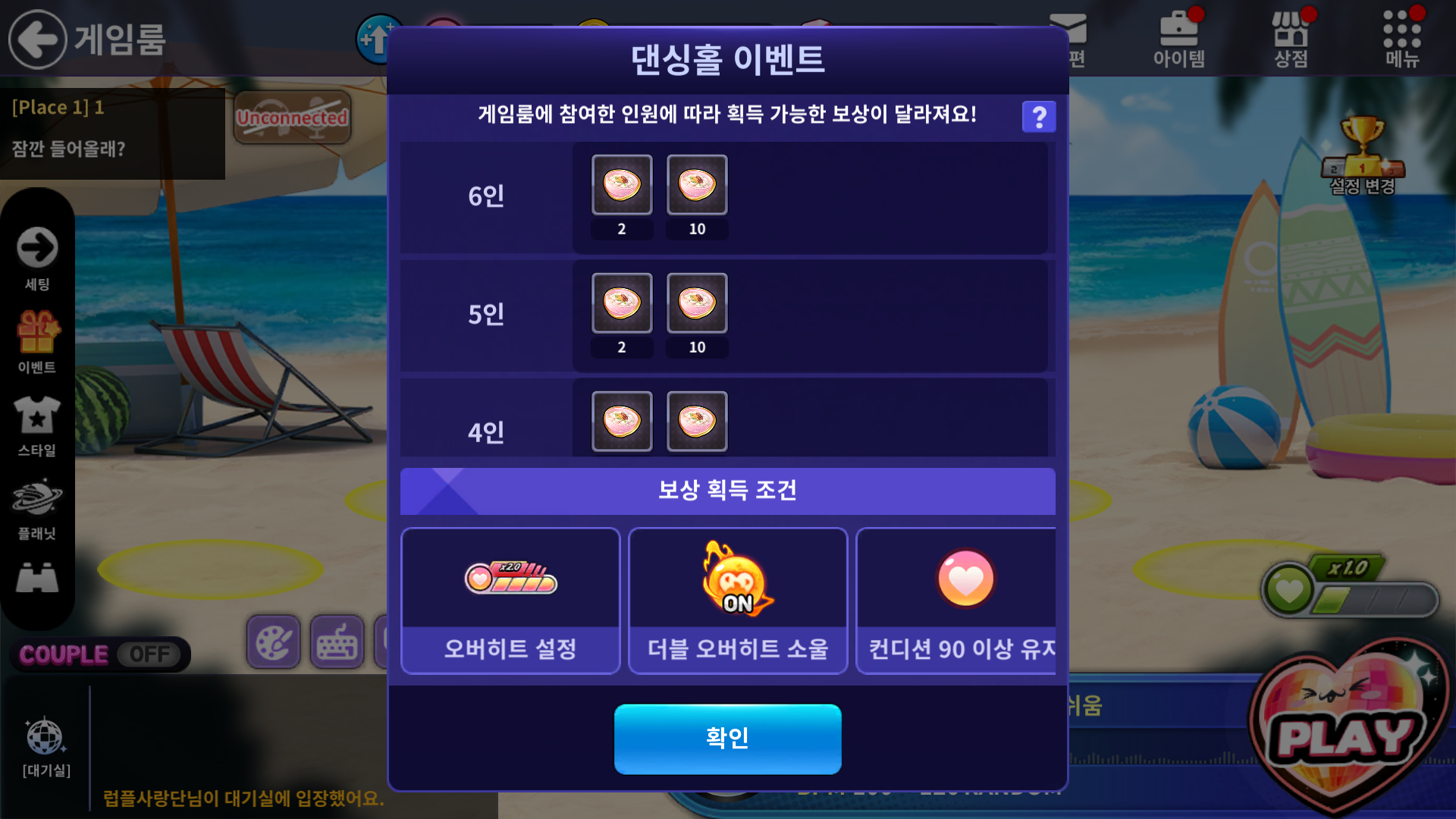 | 커플 아이돌 배틀 | 2인 | 조건 없음 | OFF | OFF | OFF | 90 |