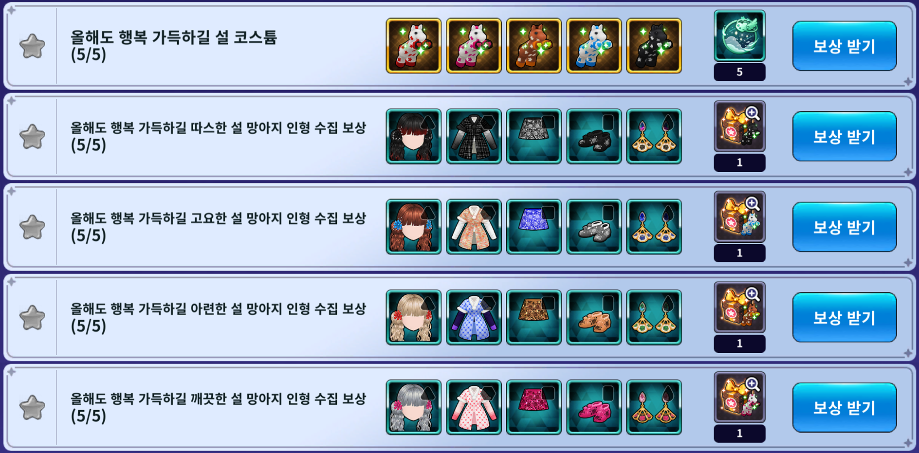 | 올해도 행복 가득하길 깨끗한 설 망아지 인형 수집 보상 | 깨끗한 설 꽃장식 트윈테일 헤어 깨끗한 설 누빔 배자 깨끗한 자수 패턴 미니 스커트 깨끗한 설 자수 패턴 털 부츠 깨끗한 설 부채 드롭 귀걸이 | 깨끗한 설 곱슬 헤어 깨끗한 설 누빔 배자 깨끗한 자수 패턴 조거 팬츠 깨끗한 설 자수 패턴 털 부츠 깨끗한 설 부채 드롭 귀걸이 | 올해도 행복 가득하길 깨끗한 설 망아지 인형 박스 |