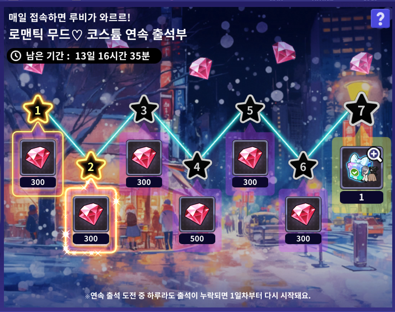 연속 7일 출석을 달성하고 최대 2,000 루비💎와 로맨틱 무드 코스튬 박스🎁를 받아가세요!