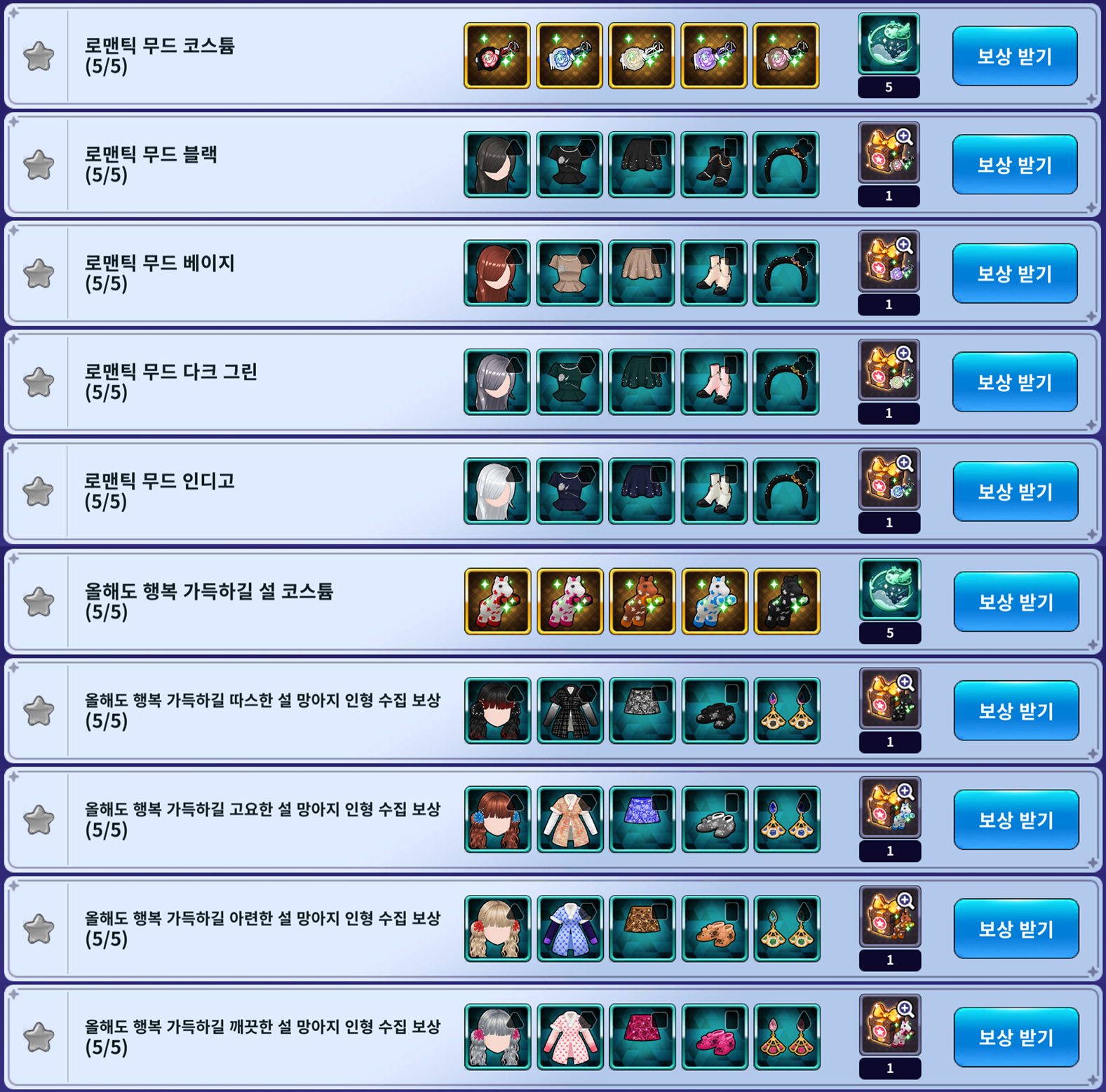 | 로맨틱 무드 인디고 | 로맨틱 무드 헤어 화이트 로맨틱 무드 투피스 상의 인디고 로맨틱 무드 투피스 하의 인디고 로맨틱 무드 펄 데코 부츠 힐 화이트 로맨틱 무드 샤이 클로버 참 헤어 밴드 | 로맨틱 로즈 블루 벨벳 박스 | |