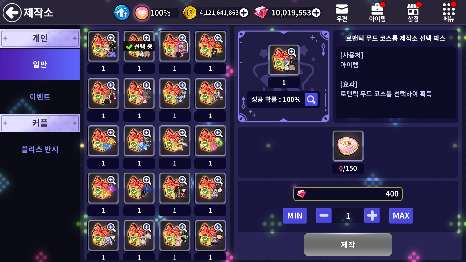 | [NEW!] 로맨틱 무드 코스튬 제작소 선택 박스 | 선배 마음에 떡떡 꾸룩꾸룩 150개 400 루비 |