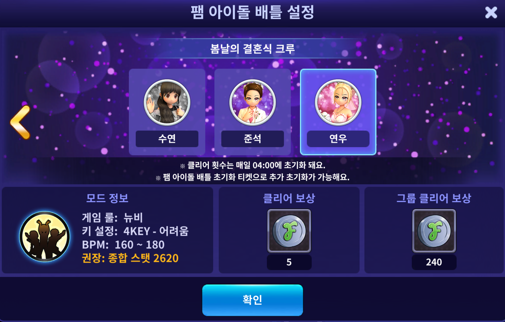 - 이벤트 기간 동안, 댄싱홀에서 팸 아이돌 배틀 모드 그룹 클리어 보상이 기존 대비 2배 증가합니다.
