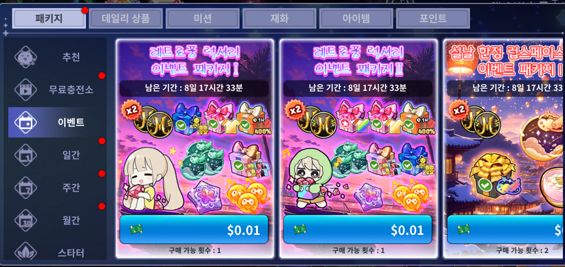 | 레트로풍 럭셔리 이벤트 패키지 l | 55,000원 | 250 | 500 | 2월 26일(목) 정기 점검 이후 ~ 3월 5일(목) 03:59 AM까지 |