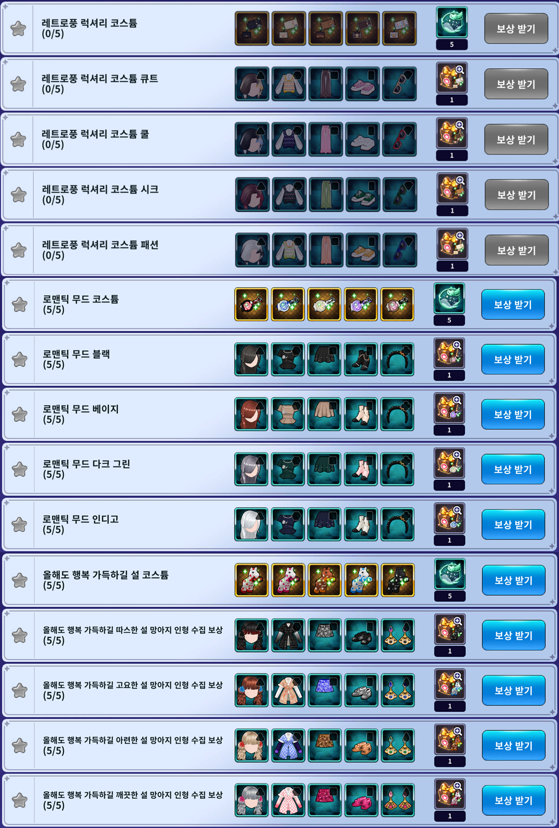 각 박스에서 지급되는 럽스페이스, 코스튬의 종류는 게임 내에서 확인 가능합니다.