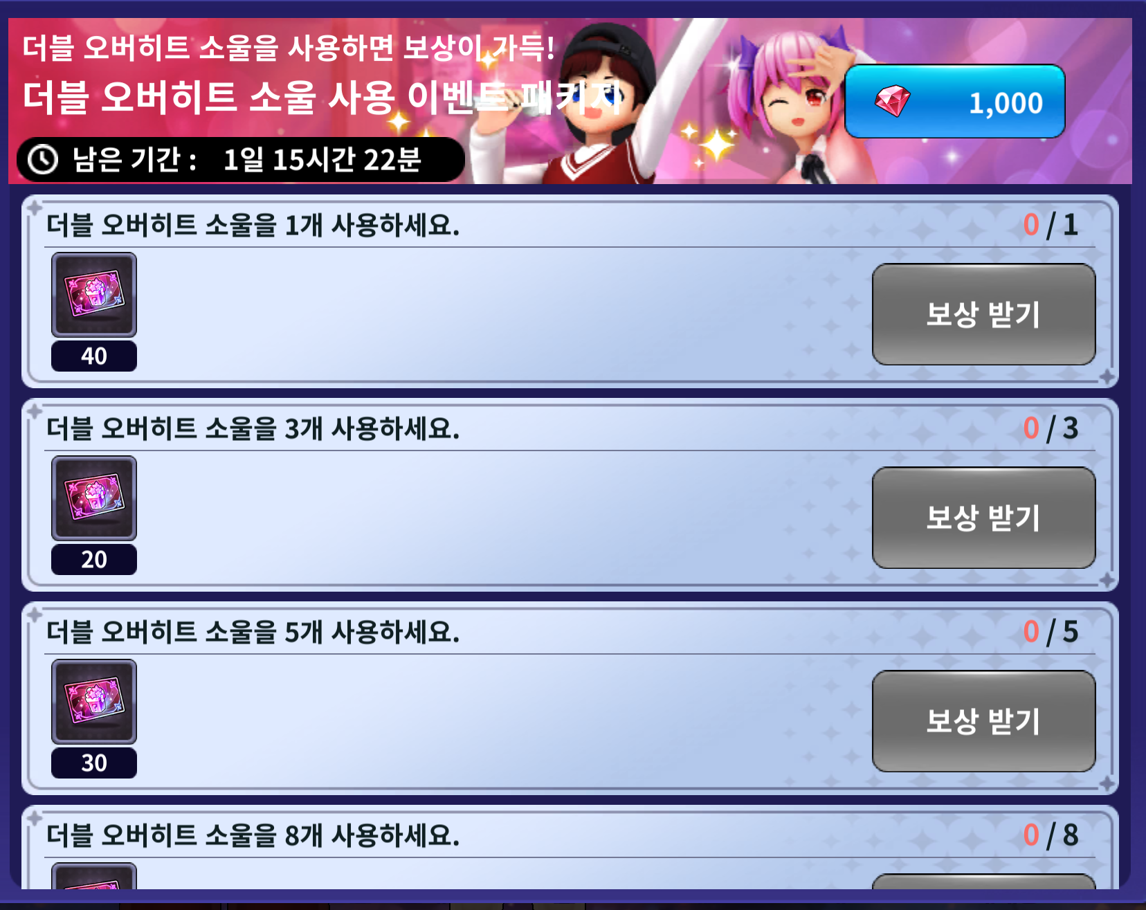 - 이벤트 패키지를 구매 후, 더블 오버히트 소울을 사용하여 미션 달성 시, 보상을 받을 수 있습니다.