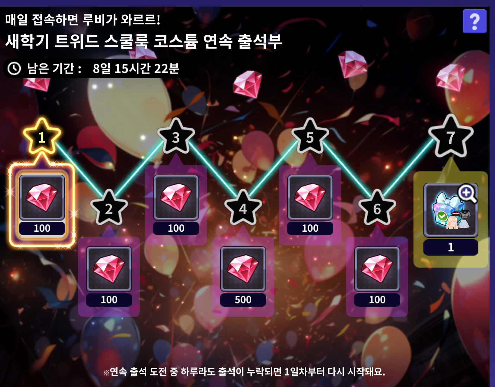 - 연속 출석에 실패할 경우 1일차부터 다시 출석이 진행됩니다.