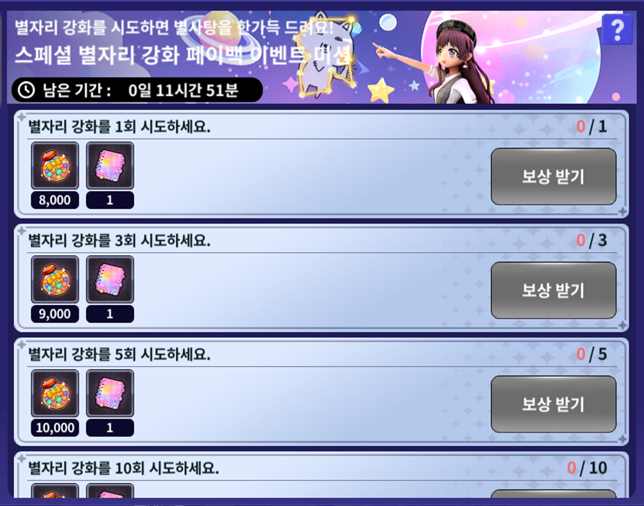 | 별자리 강화를 시도 30회 시도하세요. | 별사탕 80,000개 전교 1등의 비밀노트 20개 | ||