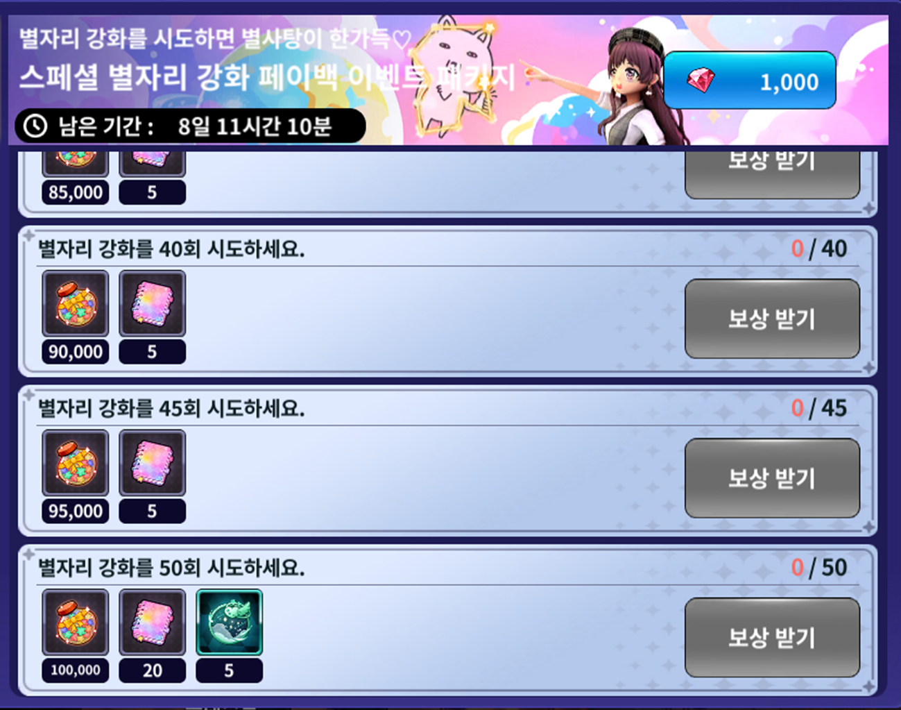 | 별자리 강화를 시도 35회 시도하세요. | 별사탕 85,000개 전교 1등의 비밀노트 5개 | ||