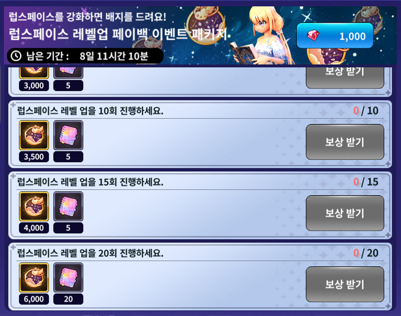 | 별자리 강화를 시도 1회 시도하세요. | 별사탕 8,000개 전교 1등의 비밀노트 1개 | 럽스페이스 레벨 업을 1회 진행하세요. | 럭셔리 럽스페이스 배지 300개 전교 1등의 비밀노트 1개 |
