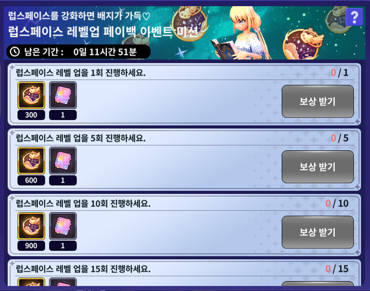 | 별자리 강화를 시도 15회 시도하세요. | 별사탕 40,000개 전교 1등의 비밀노트 5개 | 럽스페이스 레벨 업을 15회 진행하세요. | 럭셔리 럽스페이스 배지 4,000개 전교 1등의 비밀노트 5개 |