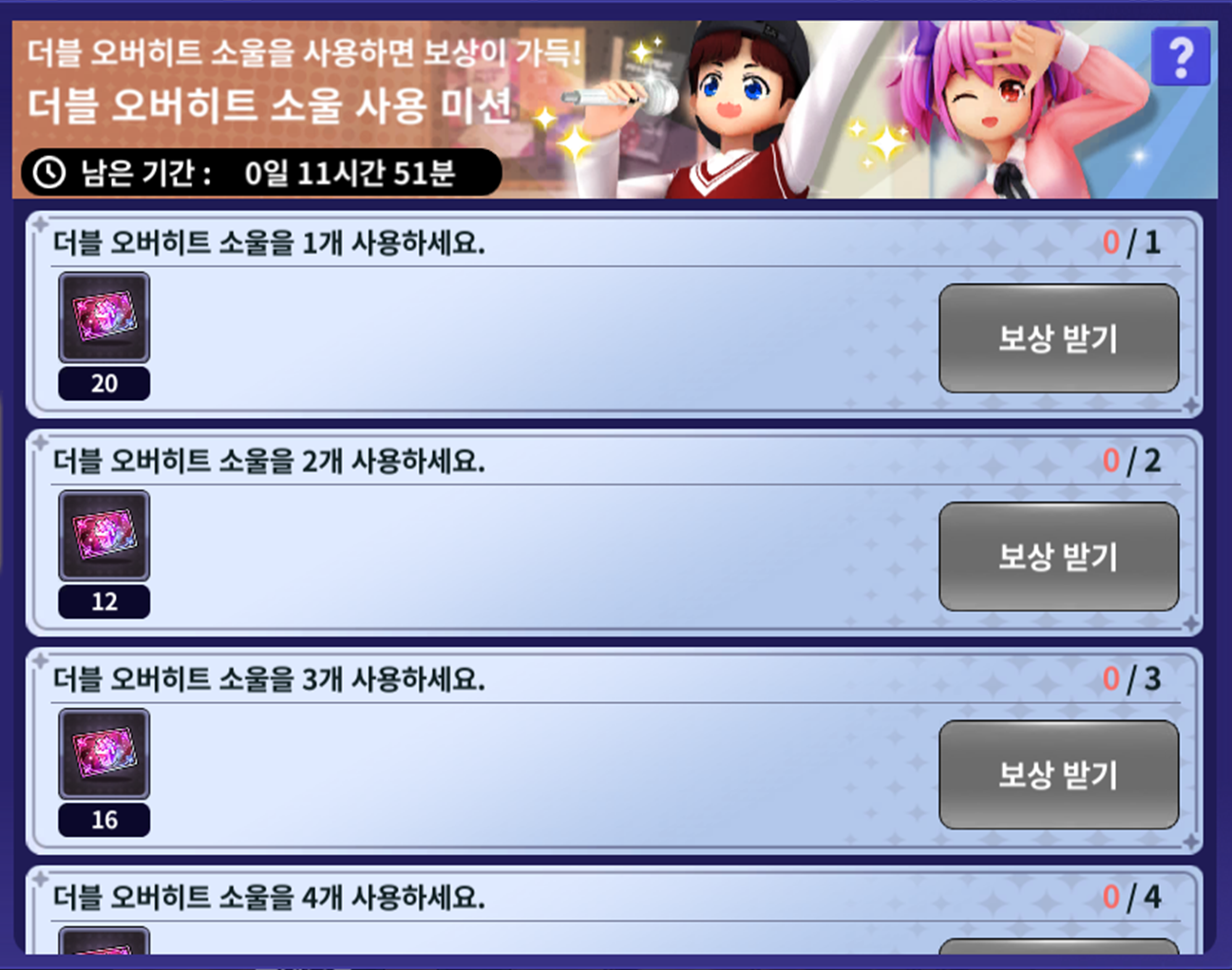 - 더블 오버히트 소울을 사용하여 미션 달성 시, 보상을 받을 수 있습니다.