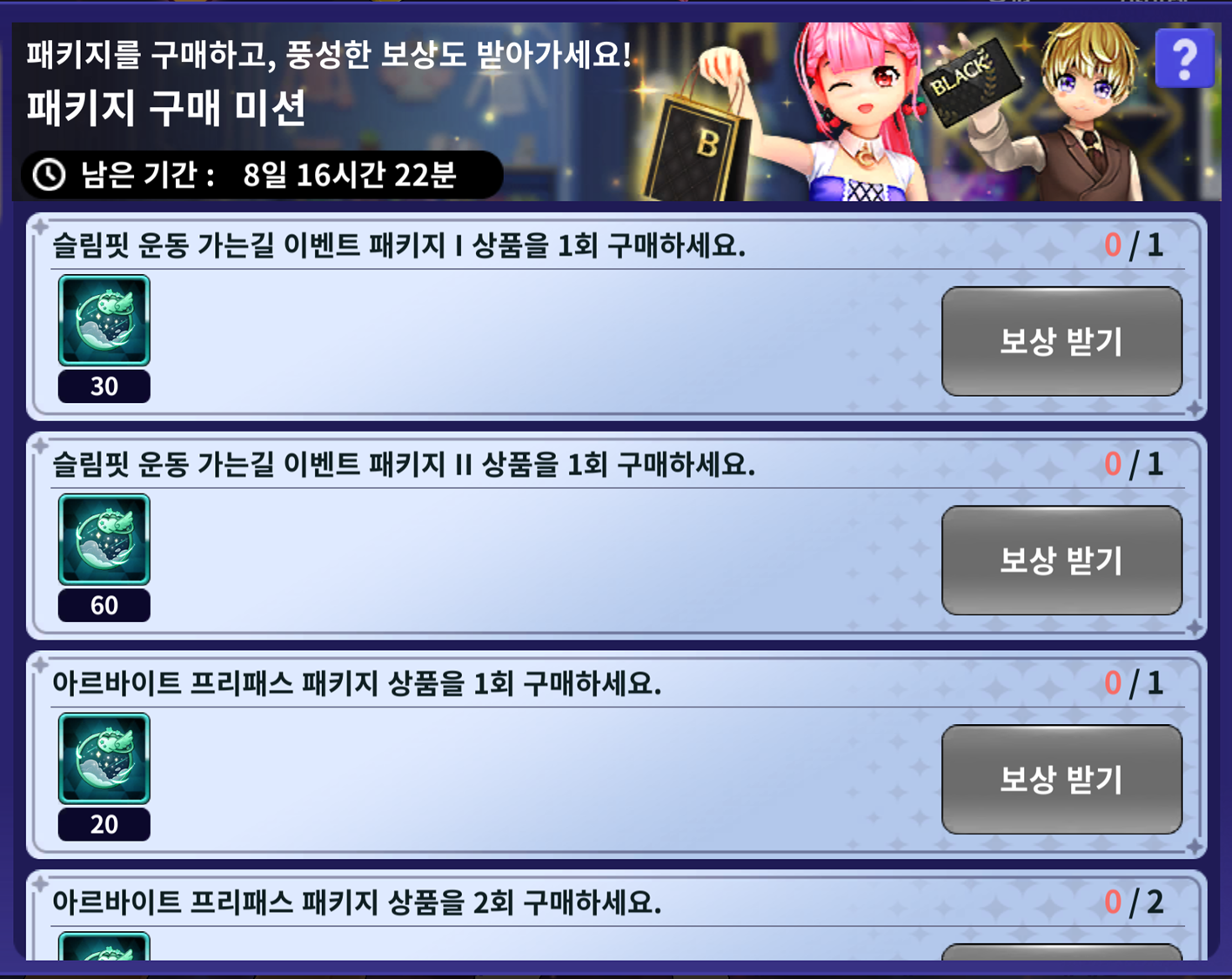 - [메인화면] - [메뉴] - [깜짝 이벤트] - [패키지 구매 미션]을 통해 확인할 수 있습니다.