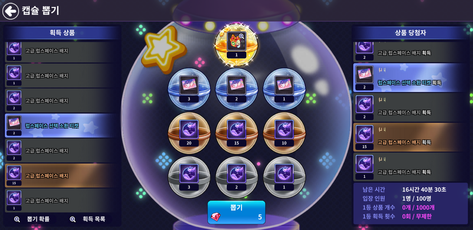 - 캡슐 뽑기 입장 후 5 루비를 지불하여 캡슐을 뽑을 수 있습니다.
