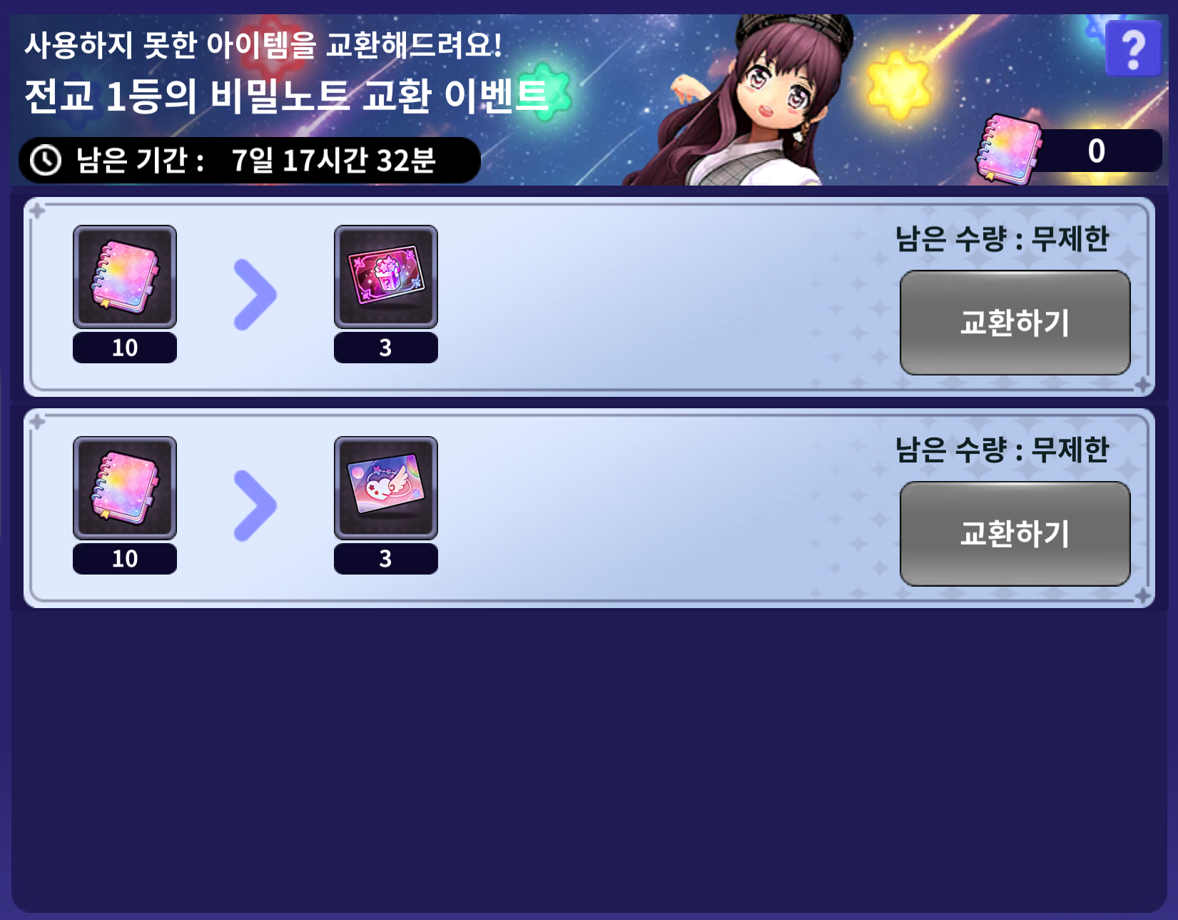 - 사용이 만료된 [전교 1등의 비밀노트] 아이템을 [별사탕 루비 상자 티켓] 또는 [럽스페이스 선택 소환 티켓]으로 교환할 수 있습니다.
