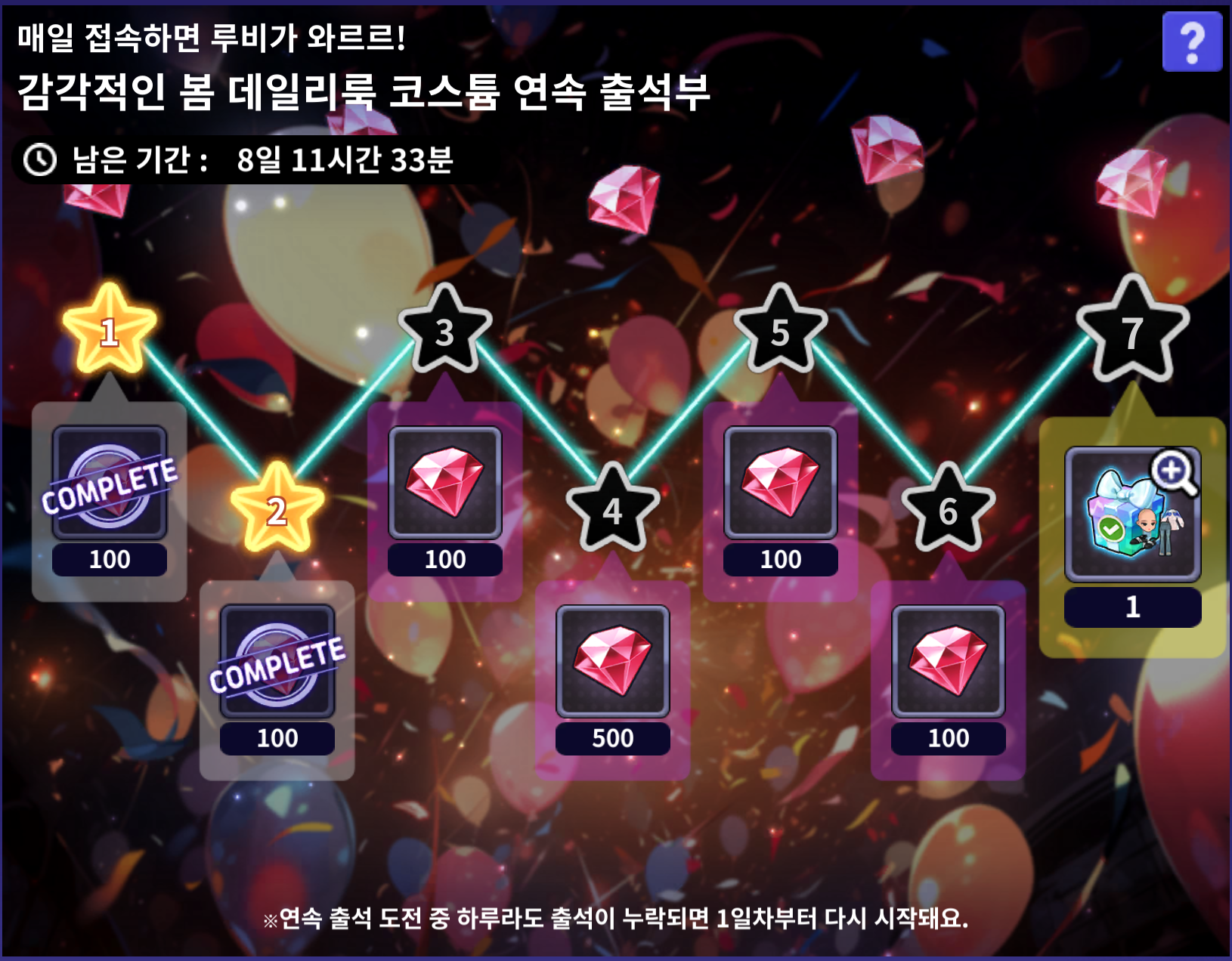 연속 7일 출석을 달성하고 최대 2,000 루비💎와 감각적인 봄 데일리룩 코스튬 박스🎁를 받아가세요!