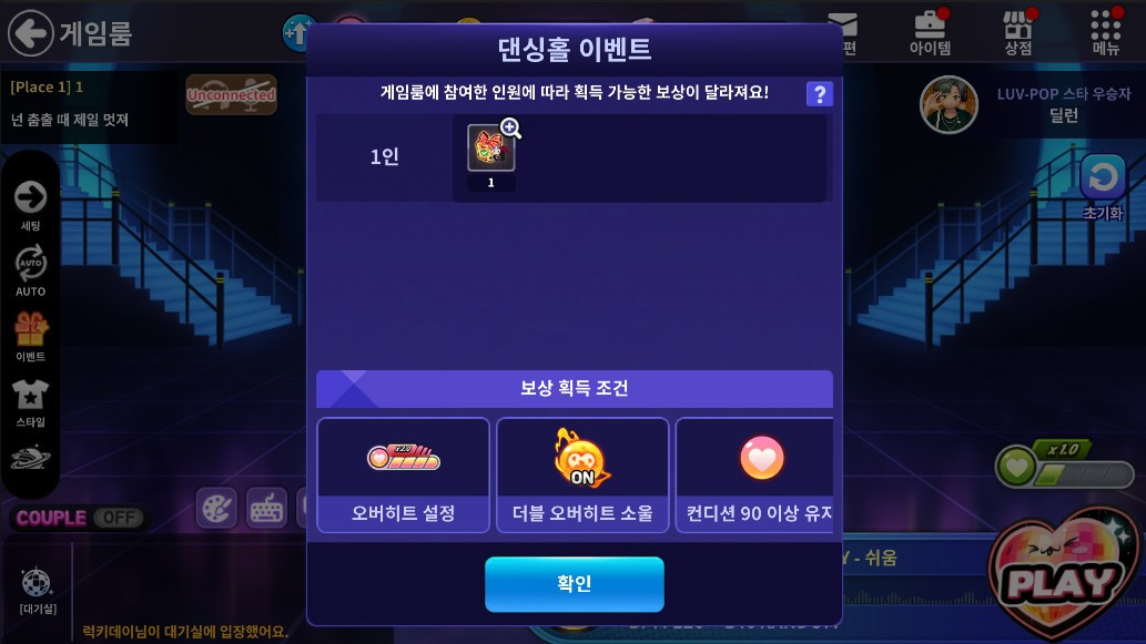 | 커플 아이돌 배틀 | 2인 | 조건 없음 | OFF | OFF | OFF | 90 |