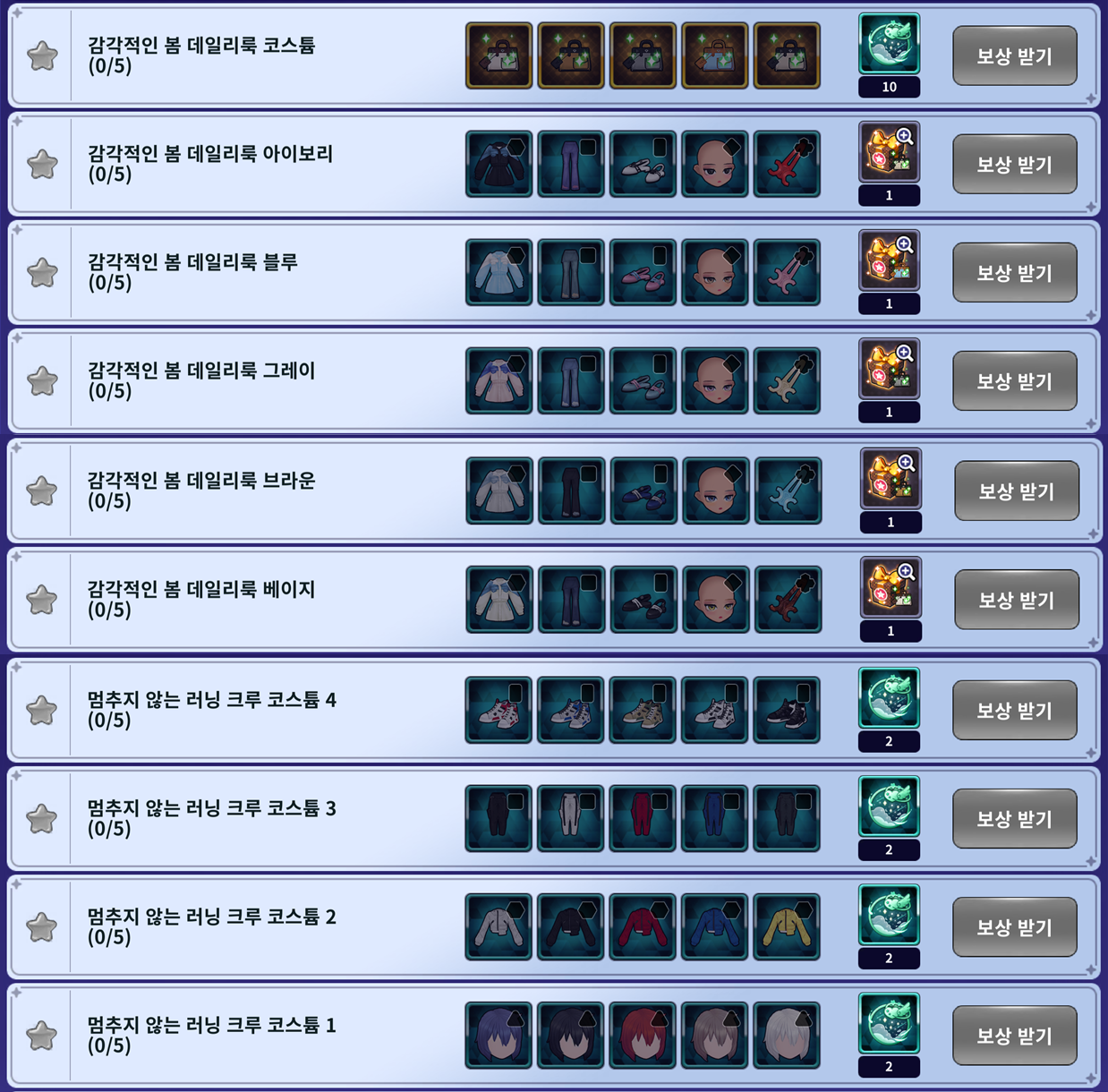 신규 코스튬 감각적인 봄 데일리룩 코스튬 5종과 멈추지 않는 러닝 크루 코스튬 5종을 모아보세요!