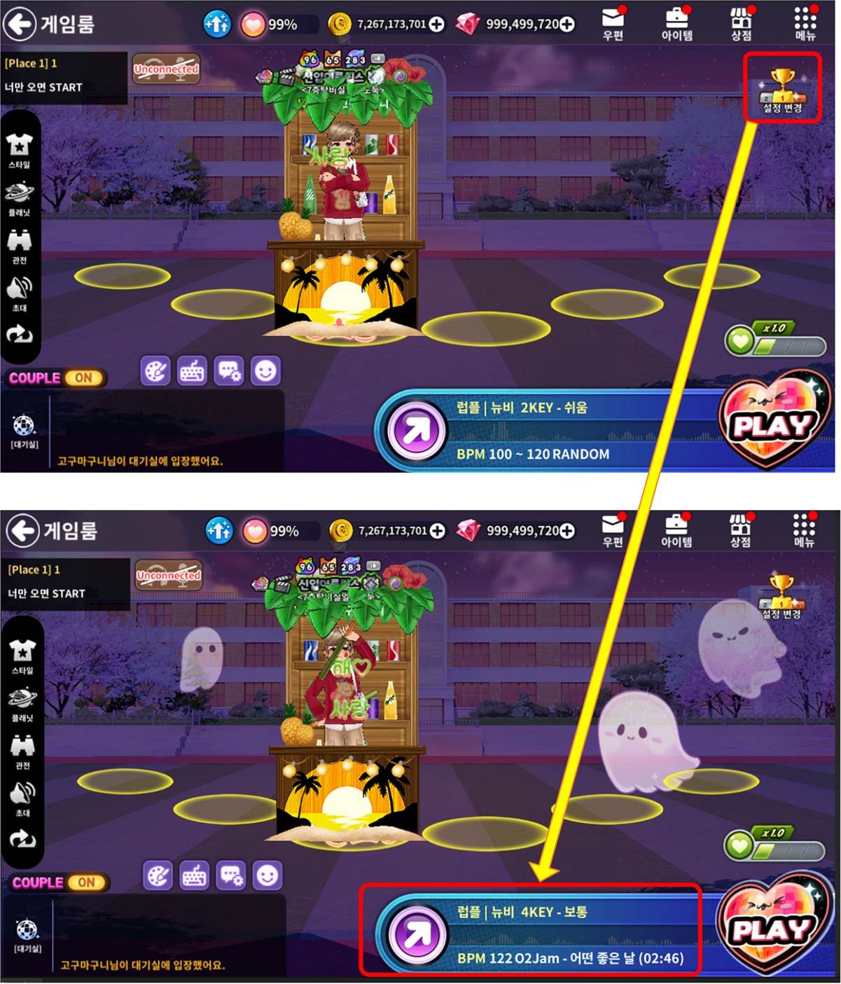 A. 게임 룸에서 ‘설정 변경’ 버튼을 터치하면 비밀의 콘테스트가 세팅 되도록 변경했습니다.