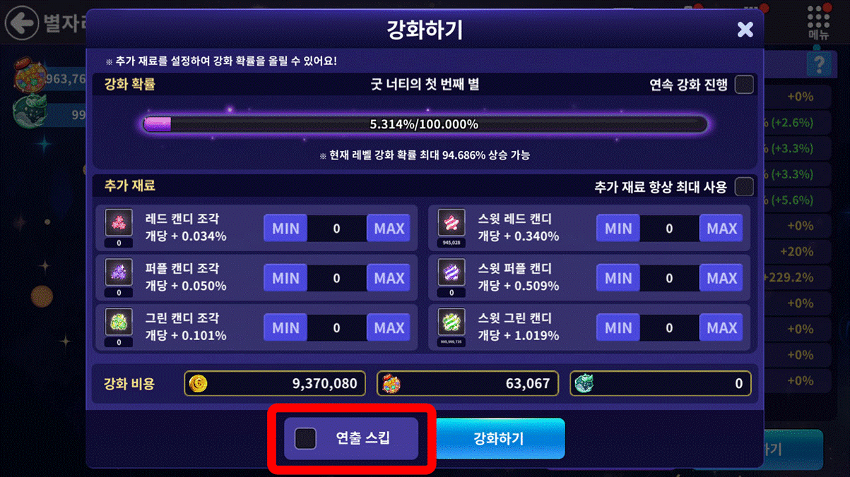 A. 별자리 강화하기 팝업에서 성공 실패 연출을 SKIP하는 기능이 추가됩니다.
