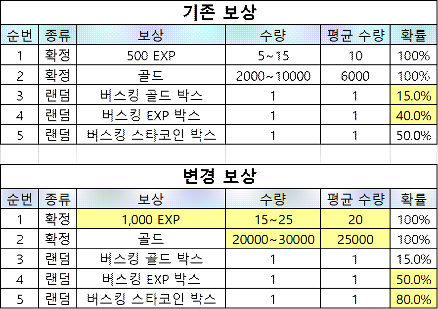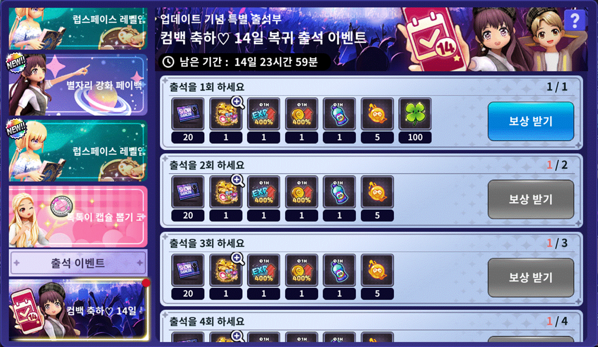 A. 복귀 스타 님을 위한 [컴백 축하♡ 14일 복귀 출석 이벤트]의 보상을 성장형 보상으로 변경했습니다.